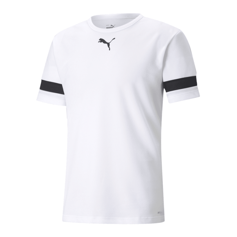 Maillot de foot 100% polyester. Col rond avec coupe classique. Bandes ajourées noires et blanches en bout de manches.